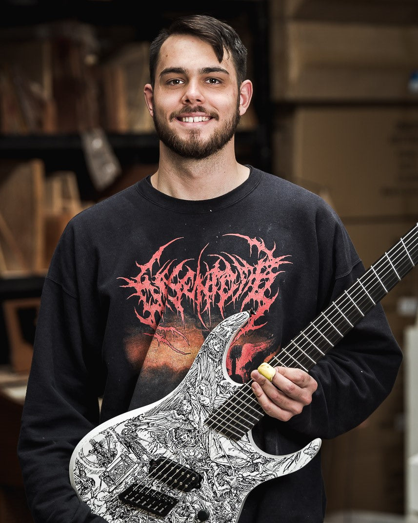 "They say instrument making is a calling, rather than a career. You're drawn to it. Without a doubt that is true. It is rarely a case of "when I grow up I want to be a guitar maker". But that is how it was. I did grow up dreaming of making fine instruments. Working with the rock stars and musicians. It just took a while to get there... I started my working life as a carpenter. It was ok, but the fine woodworking was what I gravitated towards. I transferred across to a cabinet making apprenticeship, and finished my time, achieving the highest marks recorded in our state's history. An apprentice of the year nomination was offered, but the competition wasn't for me. I just wanted to make 'stuff'. I was lucky to be working with a great team, but I needed more. A period of several years as a designer saw me get bored and uninterested, even if the money was more attractive and the workspace a bit cleaner, compared to being back 'on the bench'. Guitars were my passion. If I wasn't practicing riffs and scales, I'd be sitting there staring at a guitar, trying to work out just how they work. I bored my work colleagues to tears with my constant claims that one day, I'll make a guitar. It would be amazing, I told them. And then one day, I decided I just had to do it; my new years resolution would be to build a guitar. It had to show off my skills as a woodworker, something a bit 'more' than a Les Paul or a Strat. It would have a carved single piece Quilt Maple body, and a carved back. The neck would be laminated, and deep set in. The fretboard would be inlaid with gold and silver Mother of Pearl. I'd bind the ebony fingerboard, and continue the inlay onto the headstock. Making that guitar was the best thing I could have done. It was life changing. I no longer looked at how I could succeed in life financially... I quit my job, and sold my house. Before long, as people began to learn of my first guitar, I had clients signed up for their own instruments. It was easier than they said it would be; "they" being other luthiers I'd chatted to. "You can't make a living doing this, it's impossible" was the general cry. I didn't care. Within 18 months of starting out full time, my waiting list had grown to two years. Within a few years, I'd been offered design roles, and later on, master luthier positions with some well known manufacturers. That lack of freedom didn't interest me, I'm not one for consulting with a board of directors. I look back at my body of work over the last ten years, and feel very proud. The feeling of finishing a guitar and plugging it in for the first time, or better still, watching one of my creations played live, is a feeling that will never wane. This is what I do."