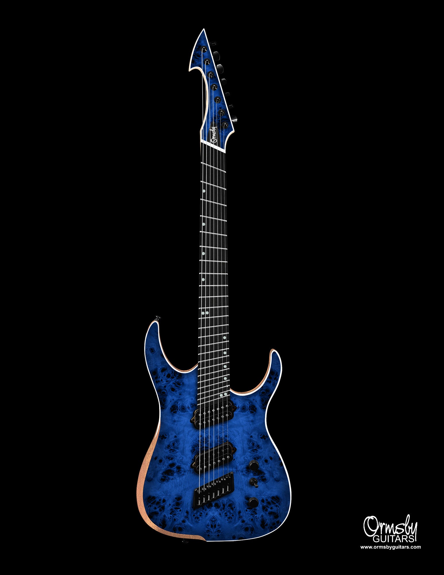 These Run 20 Hypes feature a Mahogany body topped with a Poplar Burl veneer, paired with a Rock Maple set neck, Ebony fretboard, and classic pearl dot inlays. As always, they come fully loaded with our custom Ormsby hardware, locking tuners, and signature electronics — including the Hot Rock A8 humbucker and De La Crème neck pickup for that unmistakable Ormsby tone.