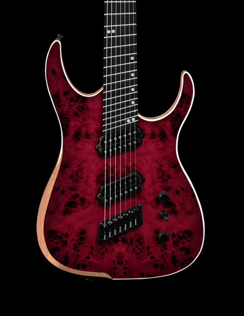 The Poplar Burl Hype GTR is available in 6, 7, or 8 strings and comes in six stunning finishes: Dahlia Black, Sophia Blue, Red Dead, Purr Pull, Venom, and Beto Blue.